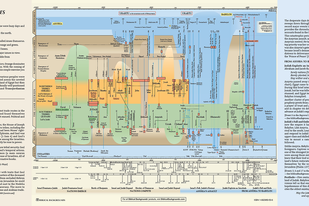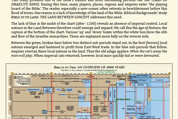 Another unique chart from Biblical Backgrounds, Inc. See in graphic relief and simple descriptions the history of ancient Israel’s kingdoms and the challenges they faced. Enter into the biblcal accounts of that history from Samuel to the Exile. See empires, kings and the intrigue of political moves in the ancient world. Understand the challenges that faced the prophets of the Bible and the events that shaped their messages. This is an excellent, affordable resource for classroom or independent study.